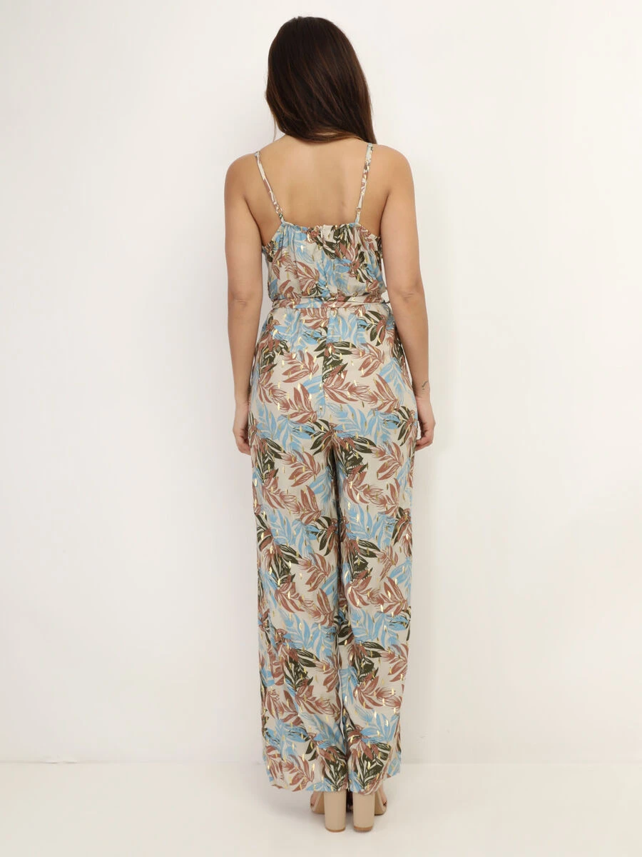 Combinaison pantalon avec motif feuilles et détails dorés.