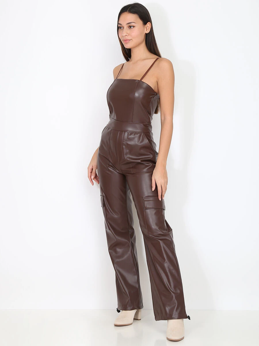 Combinaison cargo en simili avec liens de serrage au chevilles.