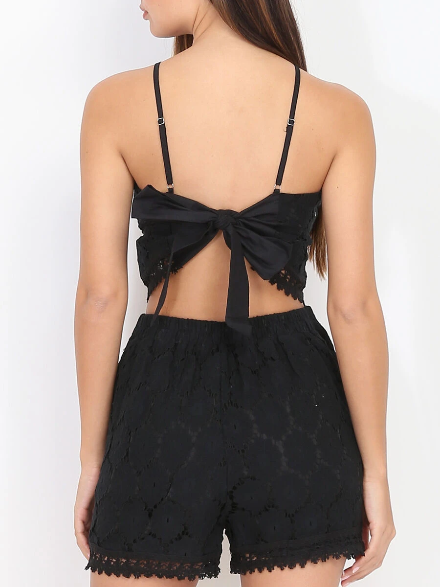 Crop top en dentelle à fines bretelles et larges lanières à nouer au dos.