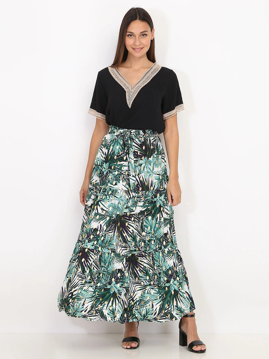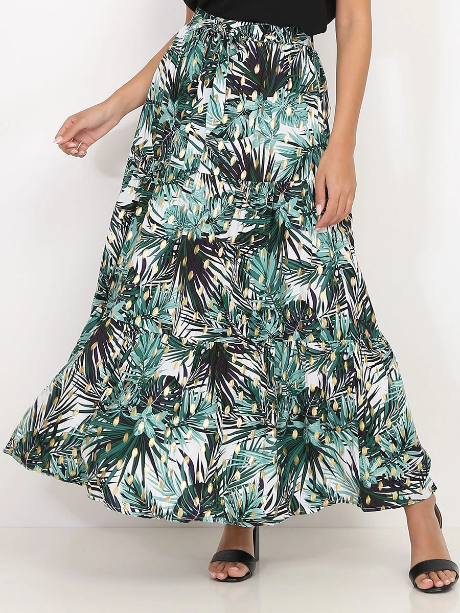 Jupe longue blanche à imprimé tropical et détails dorés.