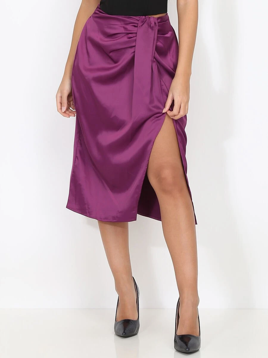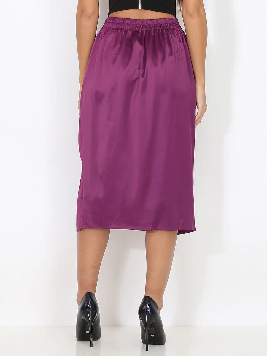 Jupe mi-longue satinée et froncée à fente avec élastique au dos.