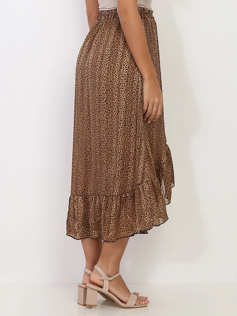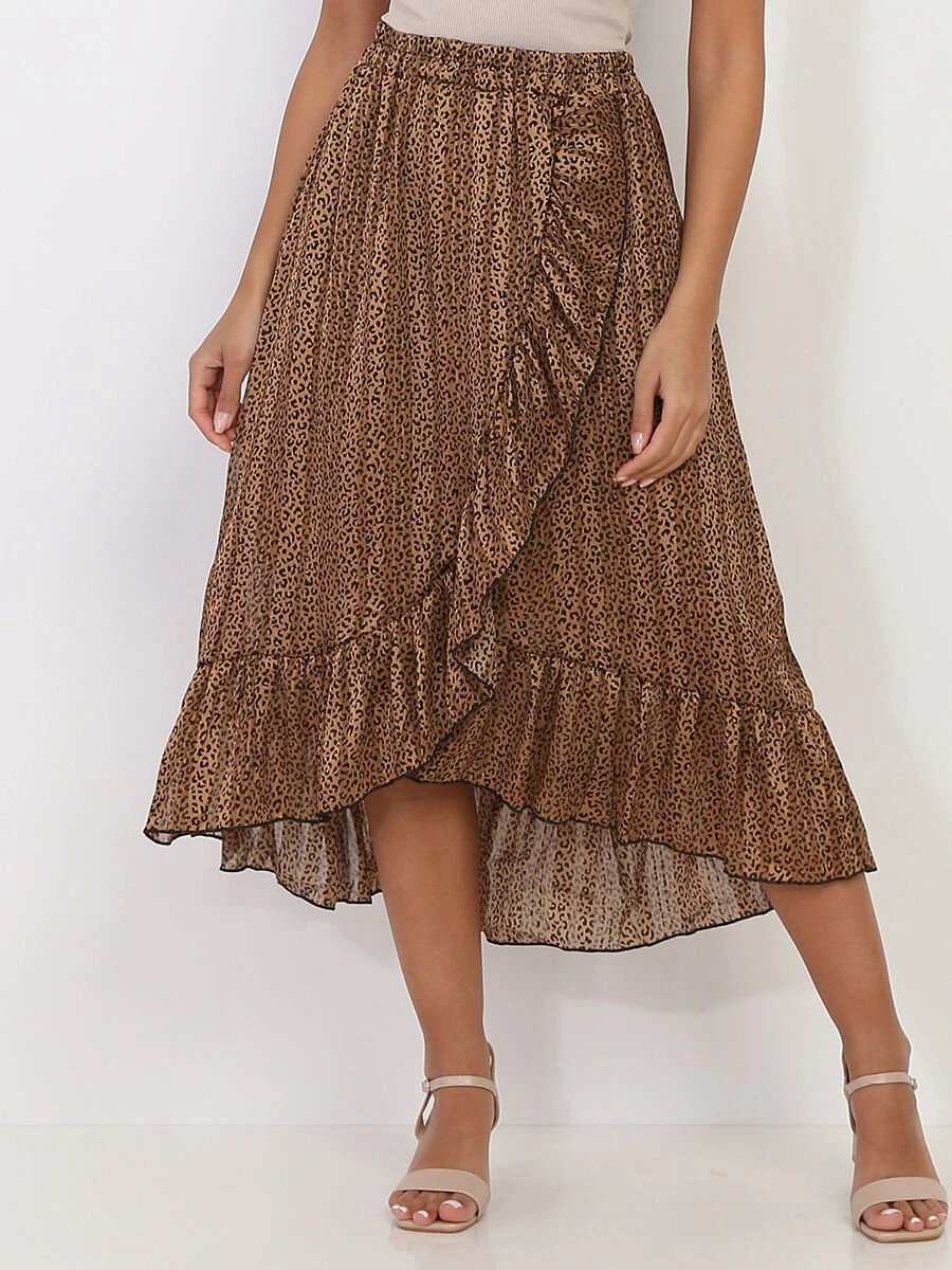 Jupe portefeuille mi-longue à imprimé léopard.
