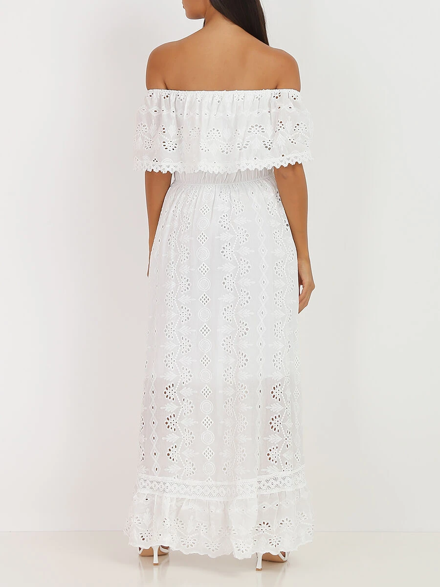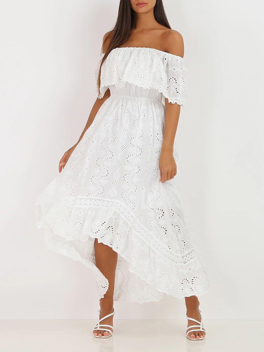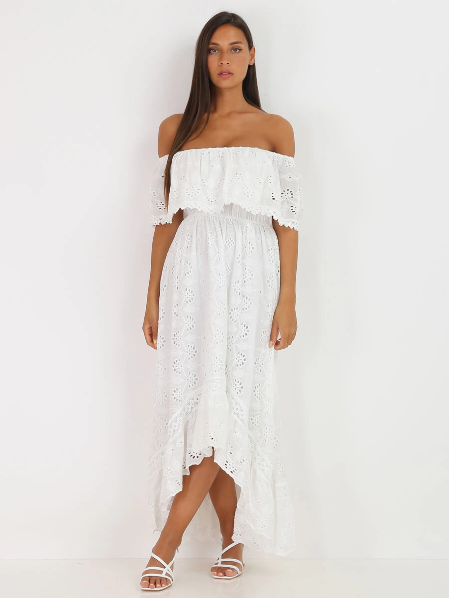 Robe longue asymétrique à broderie anglaise.
