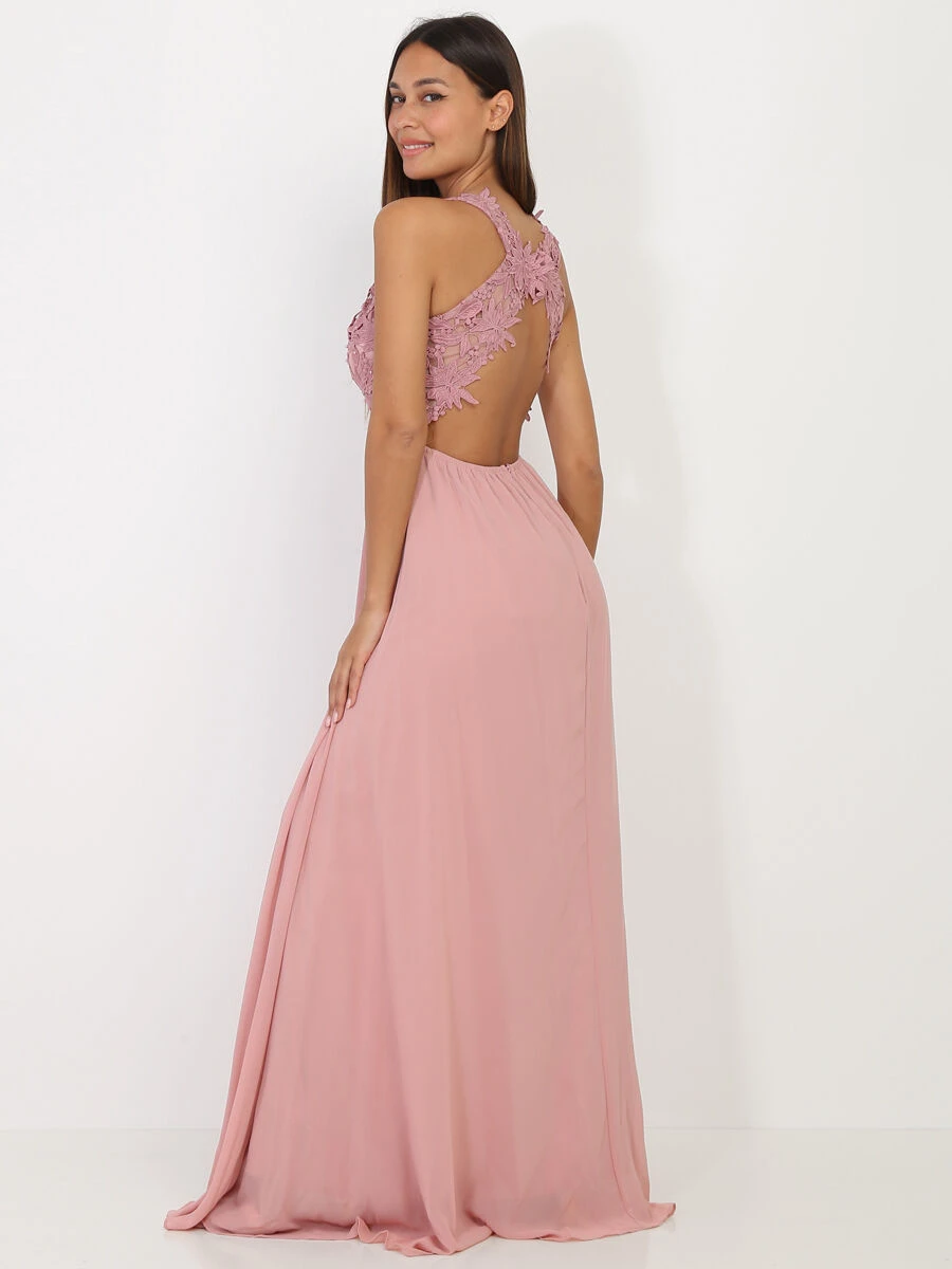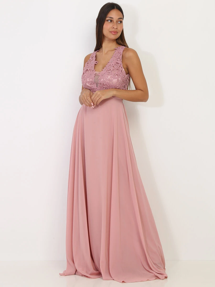 Robe longue avec haut en broderies fleuries et col V avec tulle.