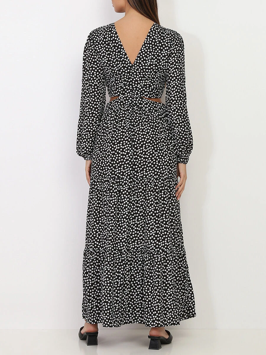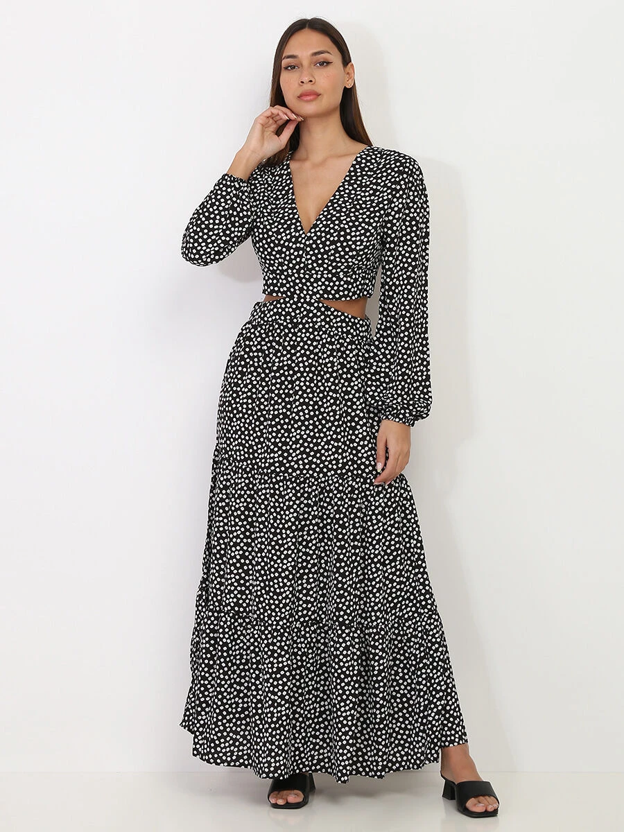 Robe longue à petites fleurs avec découpes sur les côtés.