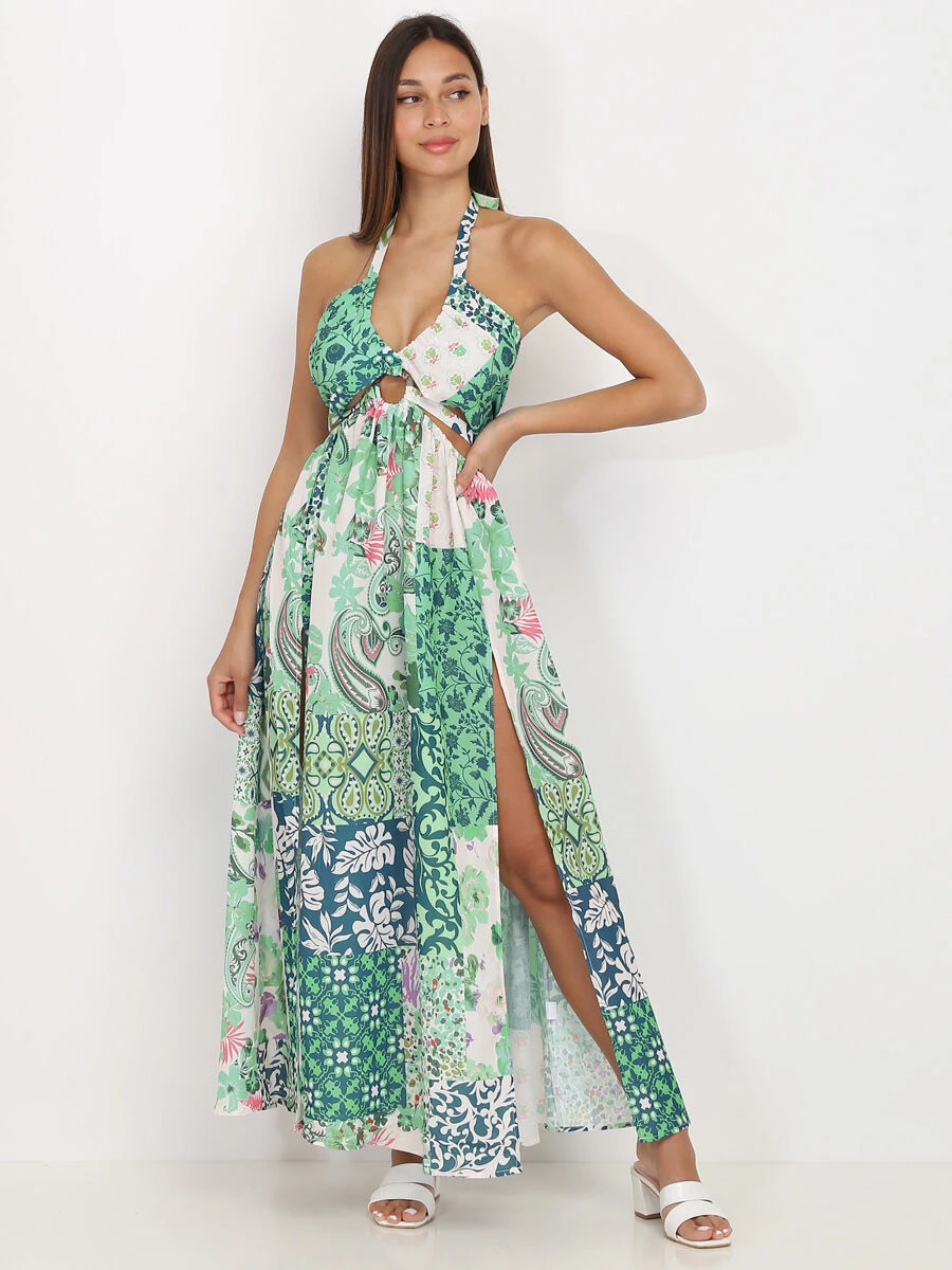 Robe longue fendue à motifs en patchwork et col en V.