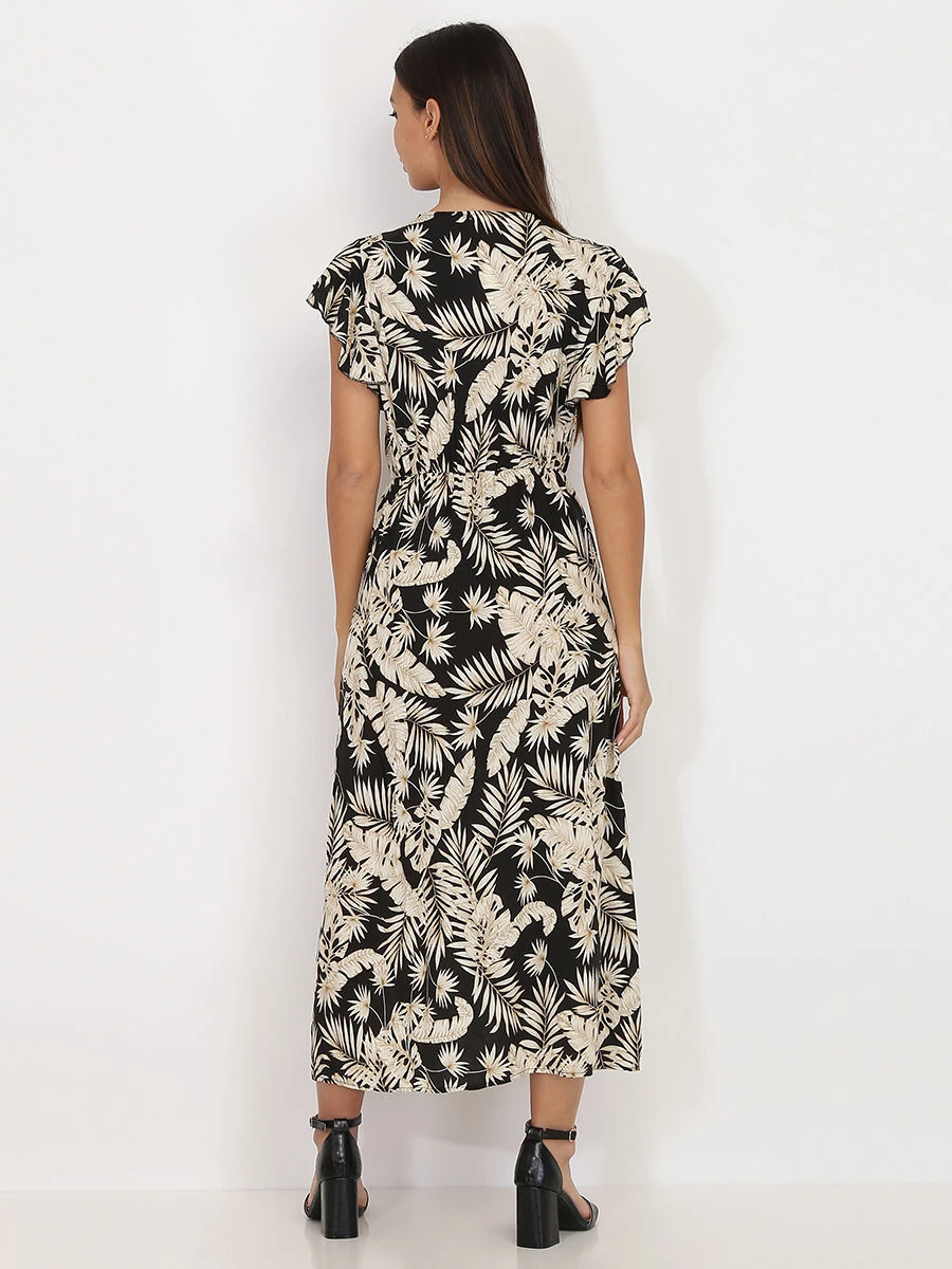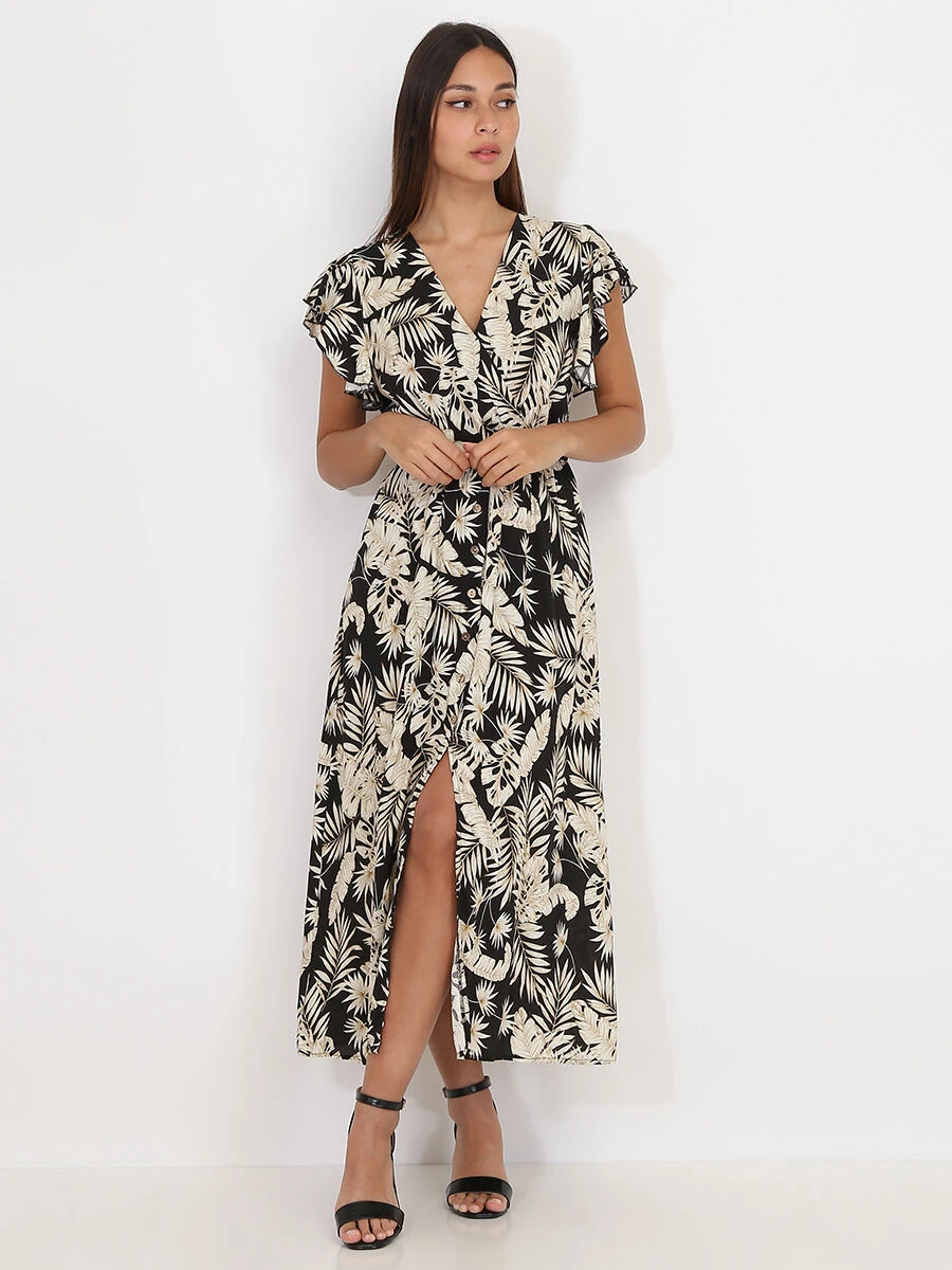 Robe longue fendue à imprimé feuilles.
