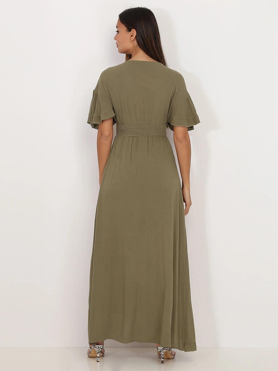 Robe longue fluide à coupe portefeuille fendue avec volants.
