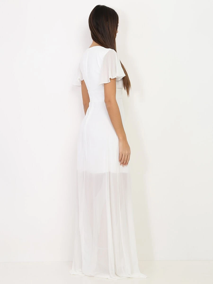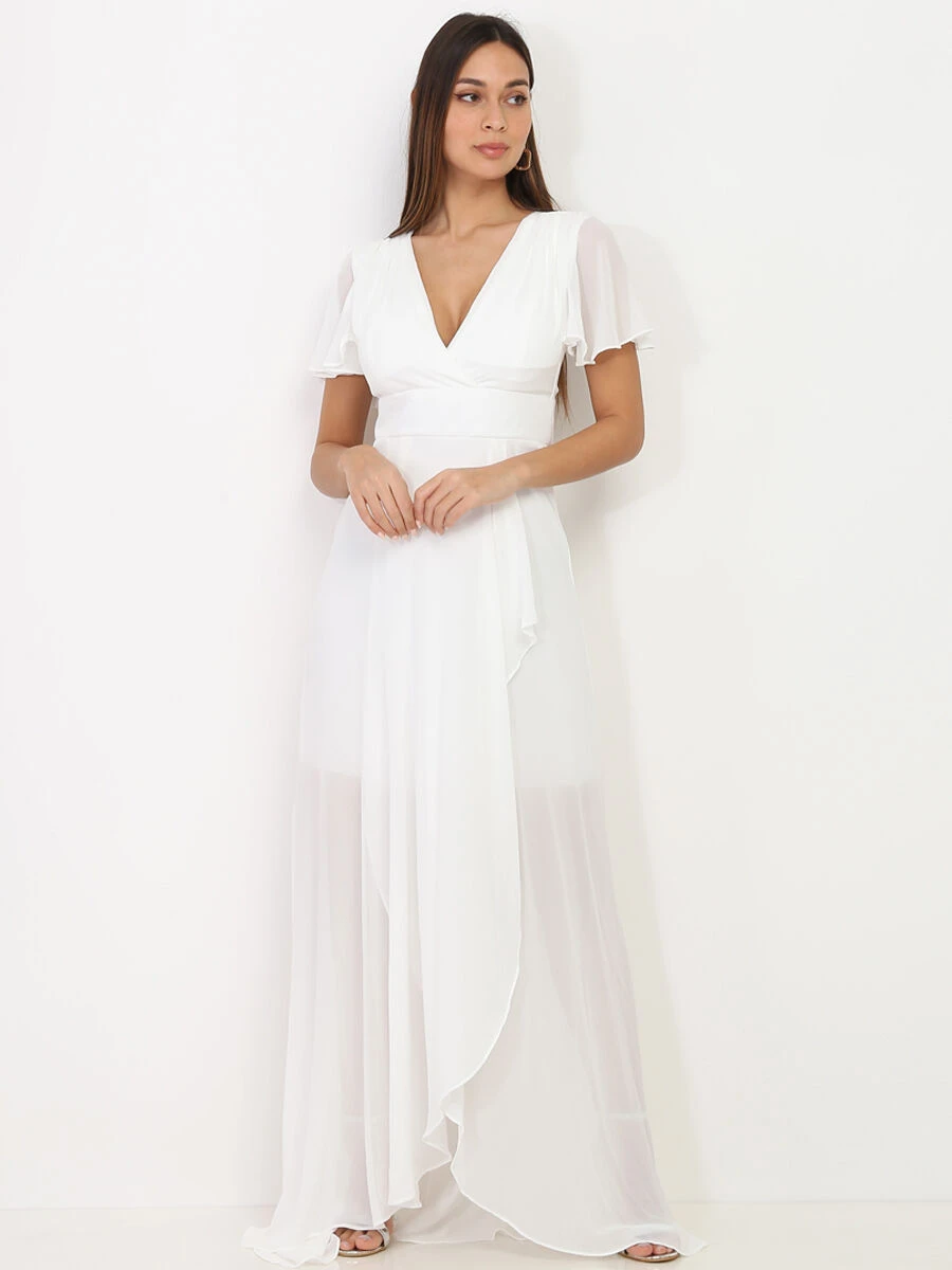 Modèle à manches courtes papillons et encolure cache-coeur.