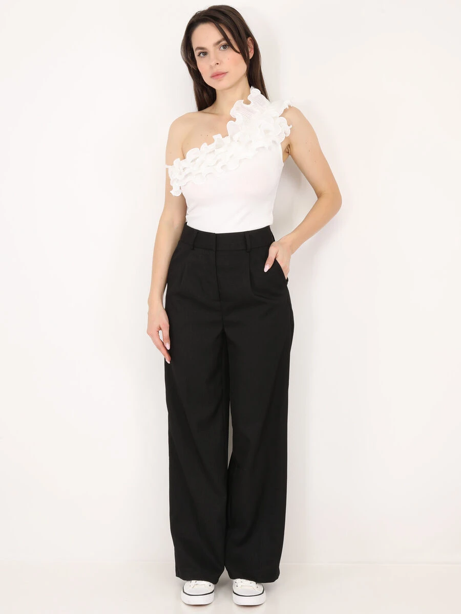 Top en maille côtelée à col asymétrique avec volants.