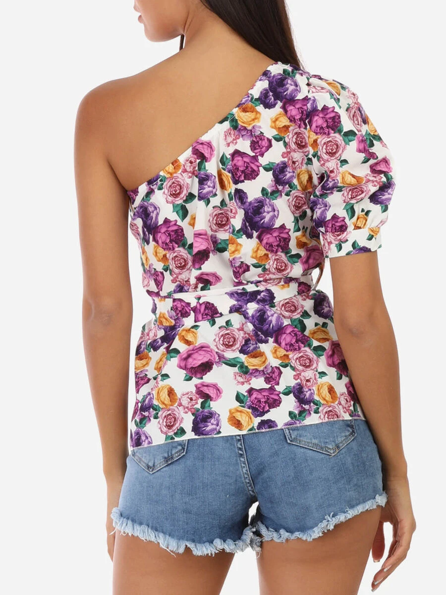 Top asymétrique fluide à motif fleuri.